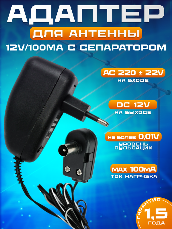 Блок питания (адаптер-выпрямитель) стабилизированный с сепаратором (ТВ штекером) 12В 100мА для телевизионных антенн с F-разъемом - 1 шт.
